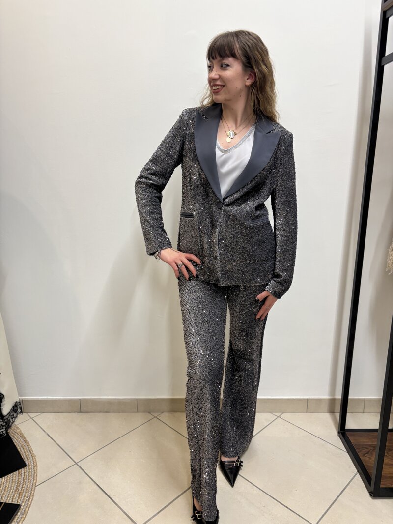 Il modello presenta una linea strutturata e femminile, valorizzata dal tessuto con effetto brillante,