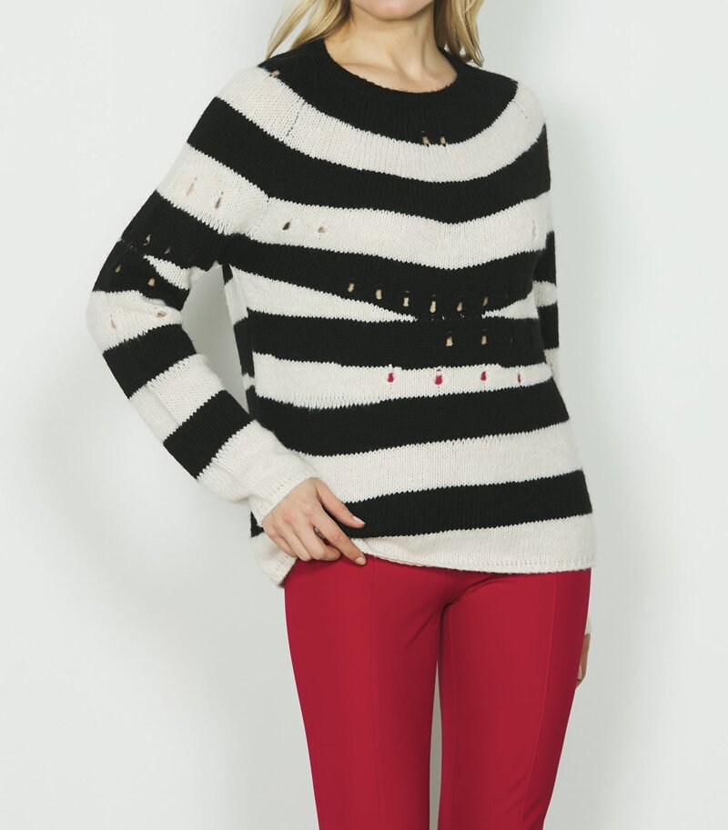 Realizzata in filato misto lana, presenta un motivo a righe bianche e nere con dettagli traforati che