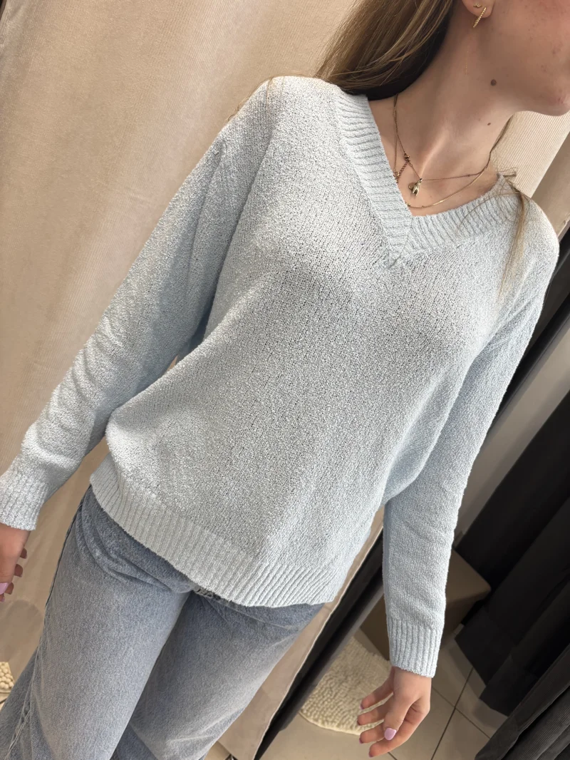 Maglione con lavorazione boucle e scollo a V , vestibilità morbida.