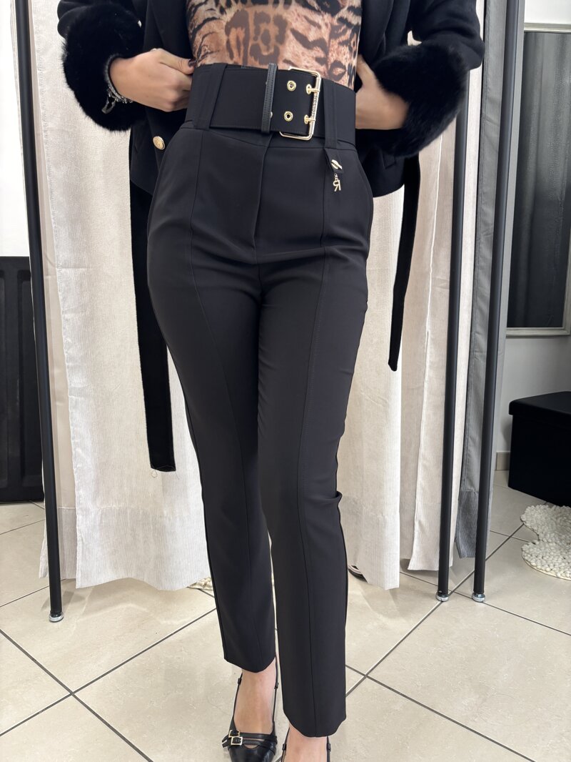 La vita è altissima e valorizzata da una cintura ampia con fibbia dorata importante, che sottolinea la